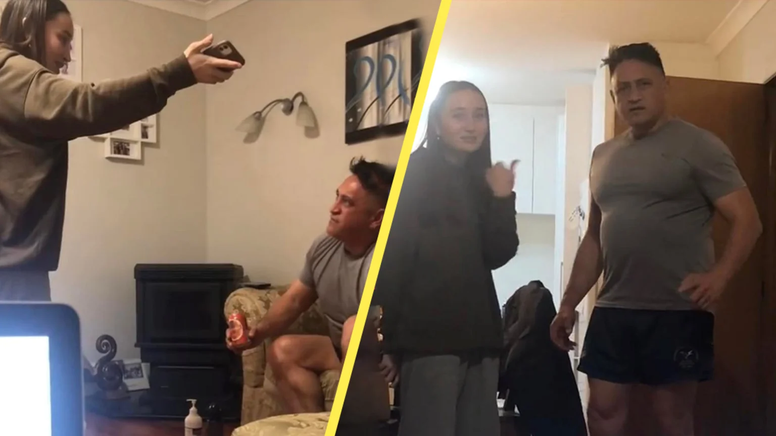 The girl, who goes by @amelia_444 on TikTok, runs into the room where her Dad is parked up on the couch sipping a cold one, looking real relaxed. That all changes when Amelia warns her dad about a scrap coming up.