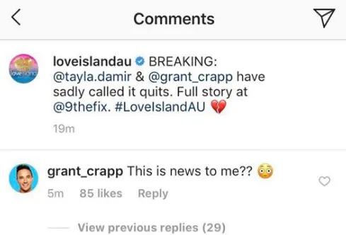 In response to the post made by @loveislandau on instagram, Grant then commented on it saying the whole thing was news to him? We can't figure out if he's joking or not?