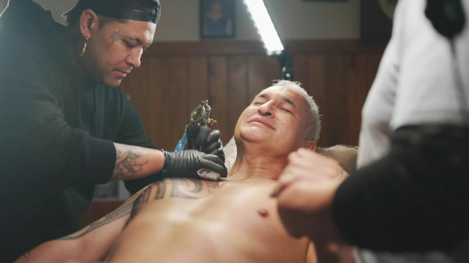 While getting the moko, Mike is visibly in pain but surrounded by his loved ones.