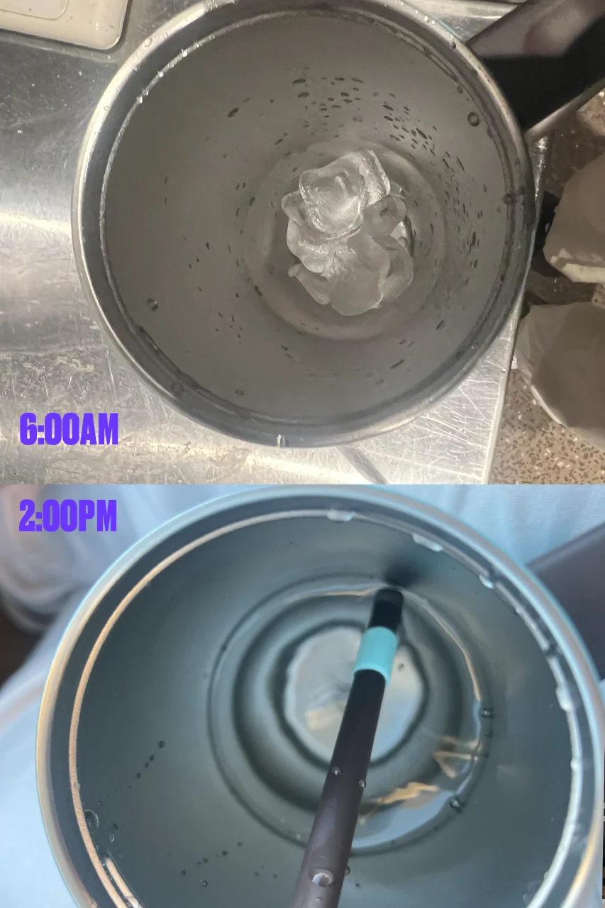 I did the same ice cube experiment as with the FreeSip, and although the water was cold at the end of my 8-hour shift, the ice cubes didn't last due to the straw's opening on top.