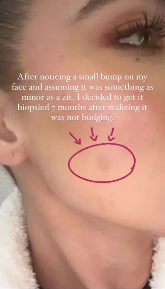 "After noticing a small bump on my face and assuming that it was something as minor as a zit, I decided to get it biopsied 7-months after realising it wasn't budging," she revealed in the first pic.