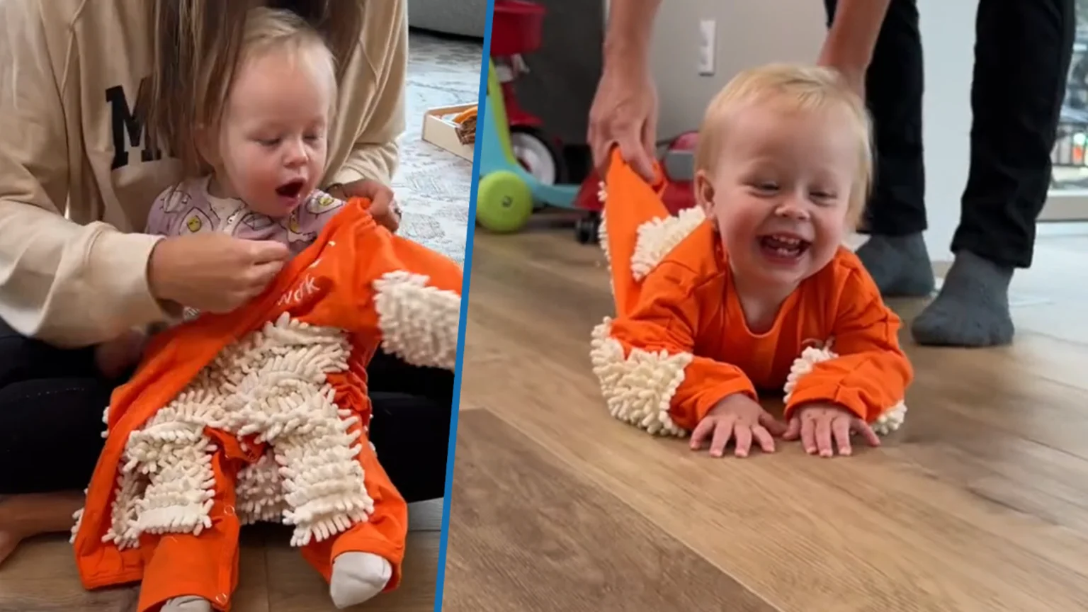 In the video, the baby is dressed in an orange outfit with the mop cover on the arms, legs, and back. The parents then slide the baby around the floor with the child, appearing to have plenty of fun throughout the video.