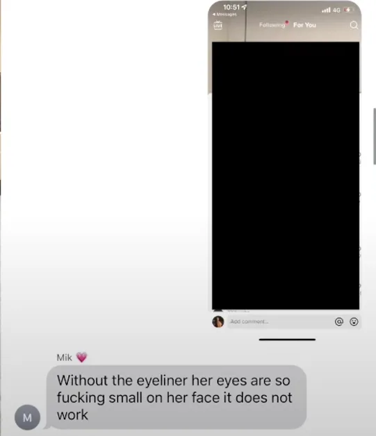 Anna then pulled up receipts showing Mikaela talking about how “f***ing small” the unnamed influencers' eyes look without eyeliner.
