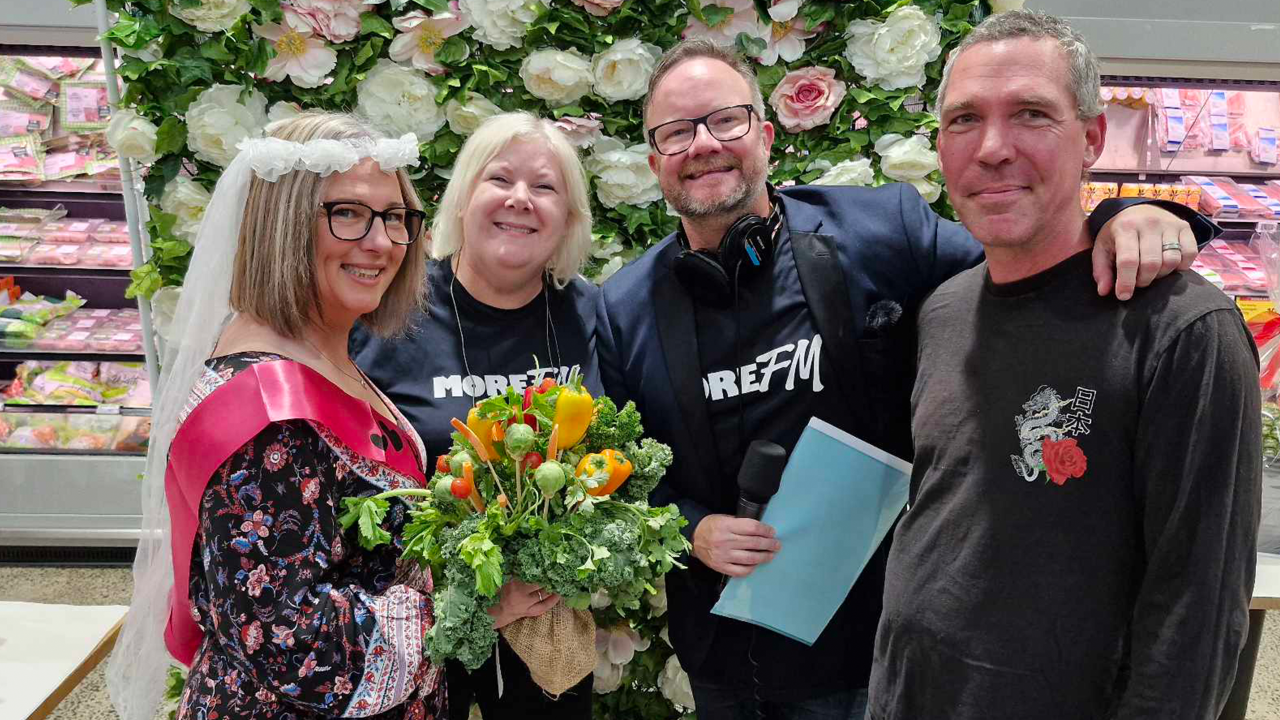 Amidst the biscuits and baking supplies, a bride adorned with a pink sash made her way towards a groom awaiting her by a flower wall in the meat aisle.