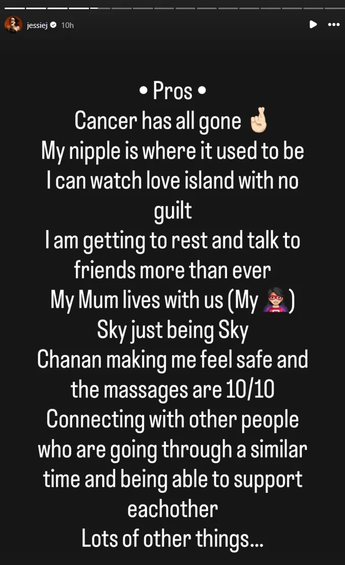 "Cancer is all gone (fingers crossed emoji). My nipple is where it used to be, I can watch Love Island with no guilt," she wrote on her Instagram Stories on Thursday. "I am getting to rest and talk to friends more than ever."