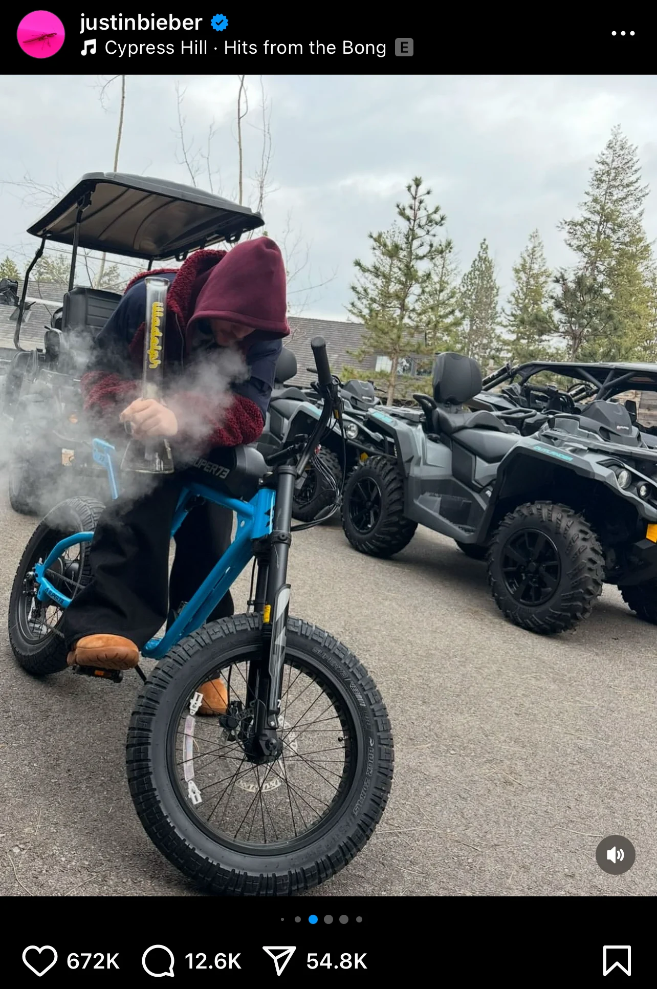 Yesterday, Justin shared photos of himself smoking from a bong while sitting on an e-bike.