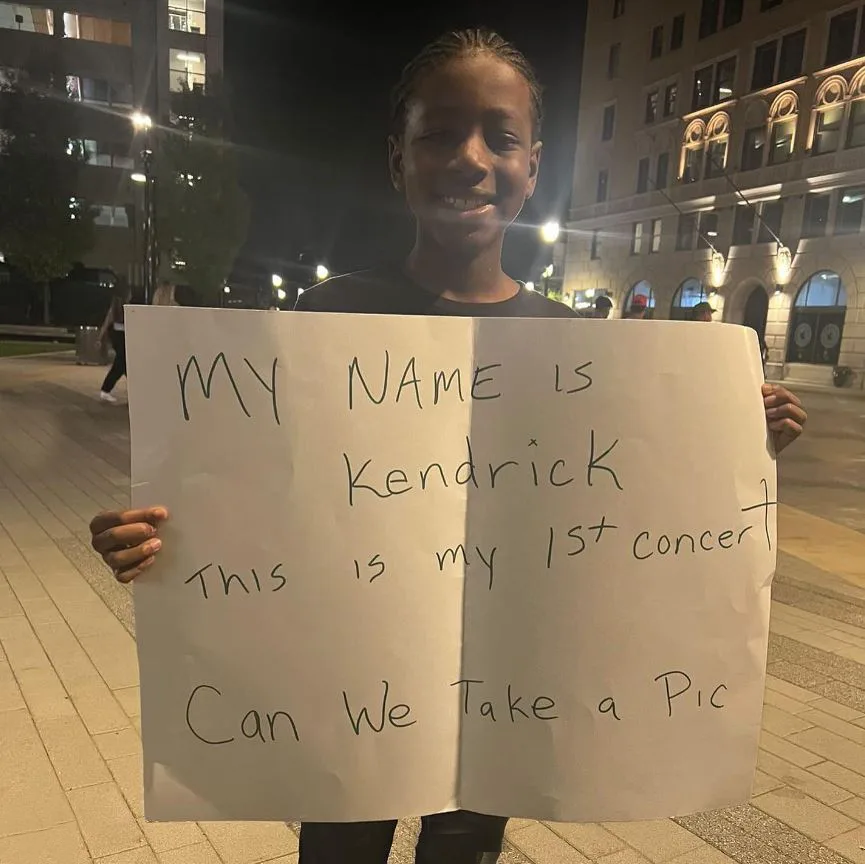 His father, Dave, took a photo of the sign, which has since circulated online. It simply reads: "My name is Kendrick. This is my 1st concert. Can we take a pic."