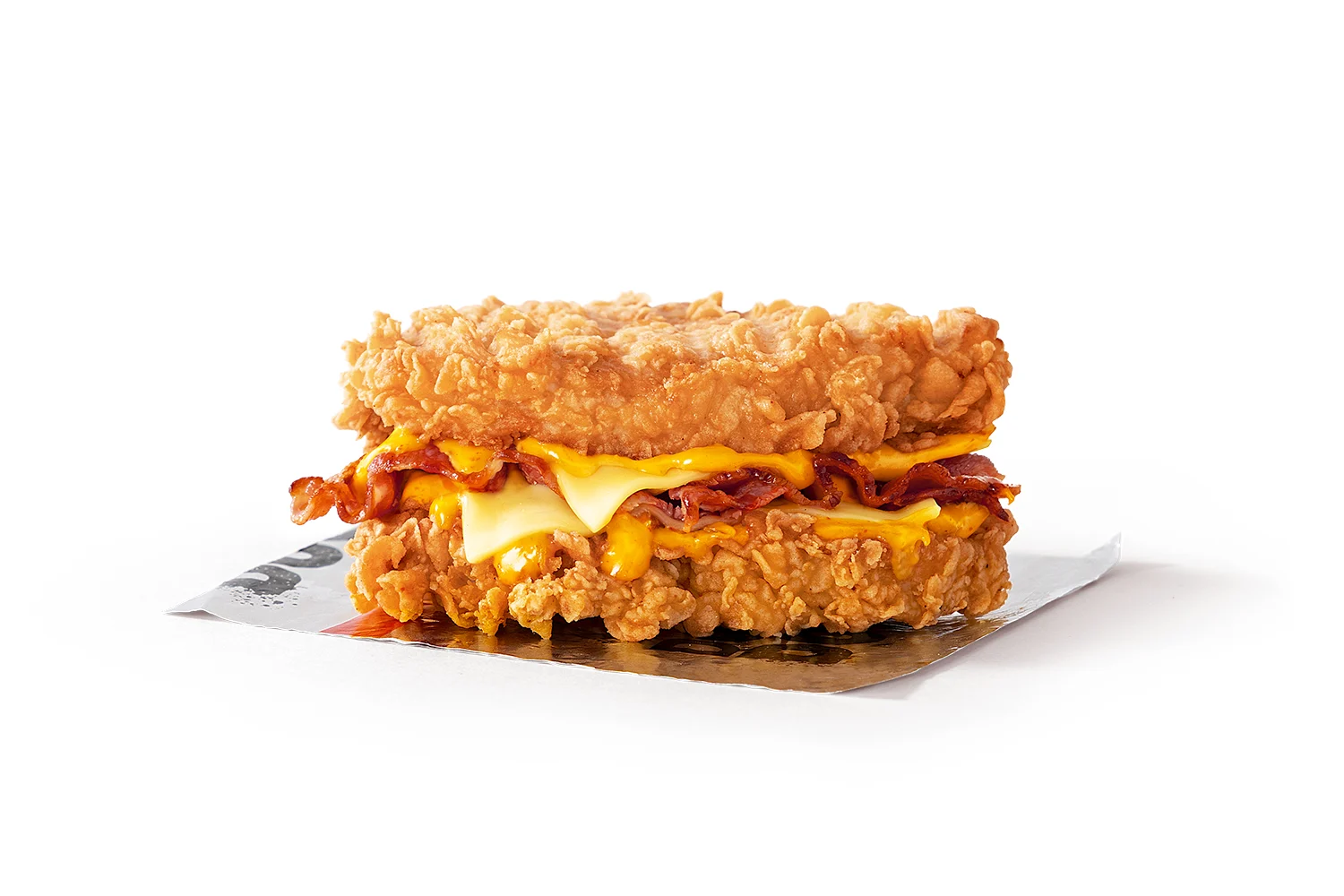 It has the two zinger fillets, bacon, cheesy sauce, and they’ve smacked a hash brown in right the middle of the lot.