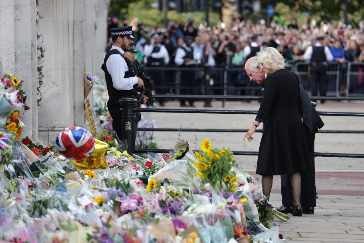 After greeting as many well-wishers as they could, the pair took a minute to stroll along the Palace's gates, lined with hundreds of flowers and memorials to the late Queen.