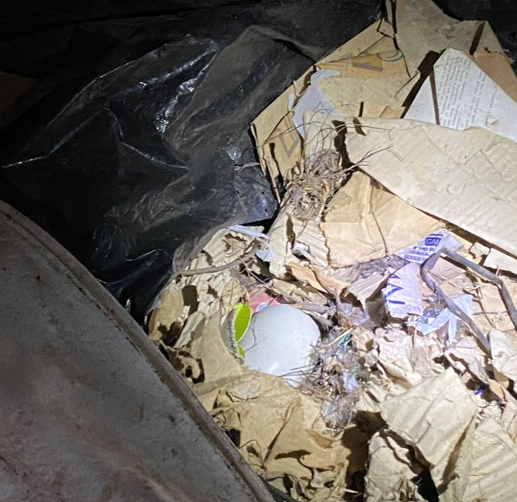 Tucked into a corner of a shed, images show a North Island brown kiwi had created a makeshift nursery using a mix of plastic, paper and whatever else he could find.
