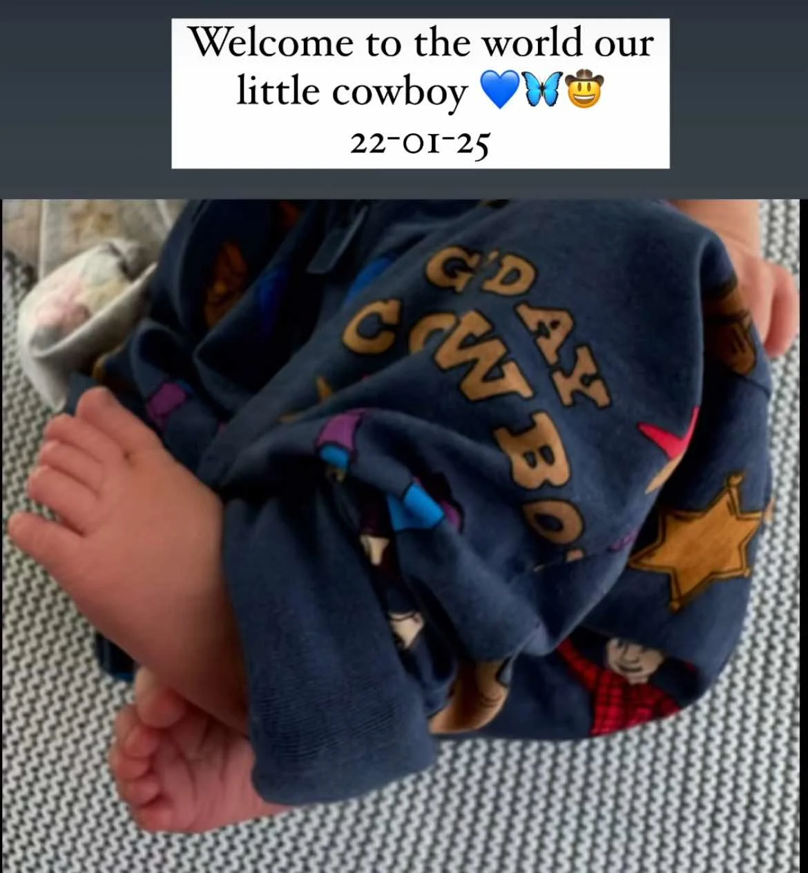 Bell shared an image of her baby boy dressed in cowboy pants on her Instagram story, saying: “Welcome to the world, our little cowboy. 22-01-25.”