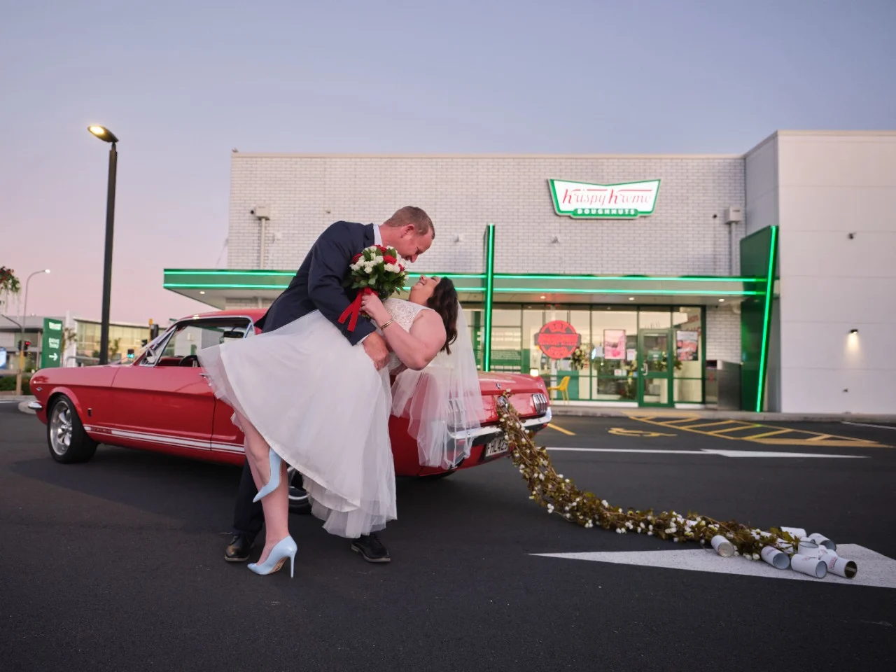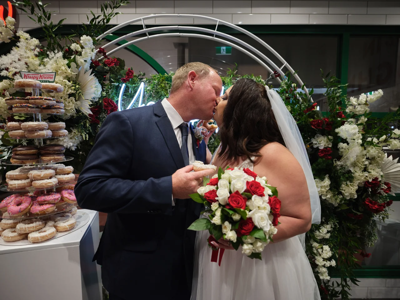 Back on Valentine's Day 2013, Cimonette and Carl Labuschange spontaneously headed to a beach and eloped, ten years later and still going strong, the self-confessed sweet treat admirers tied the knot at an Auckland Krispy Kreme spot after winning an online competition.
