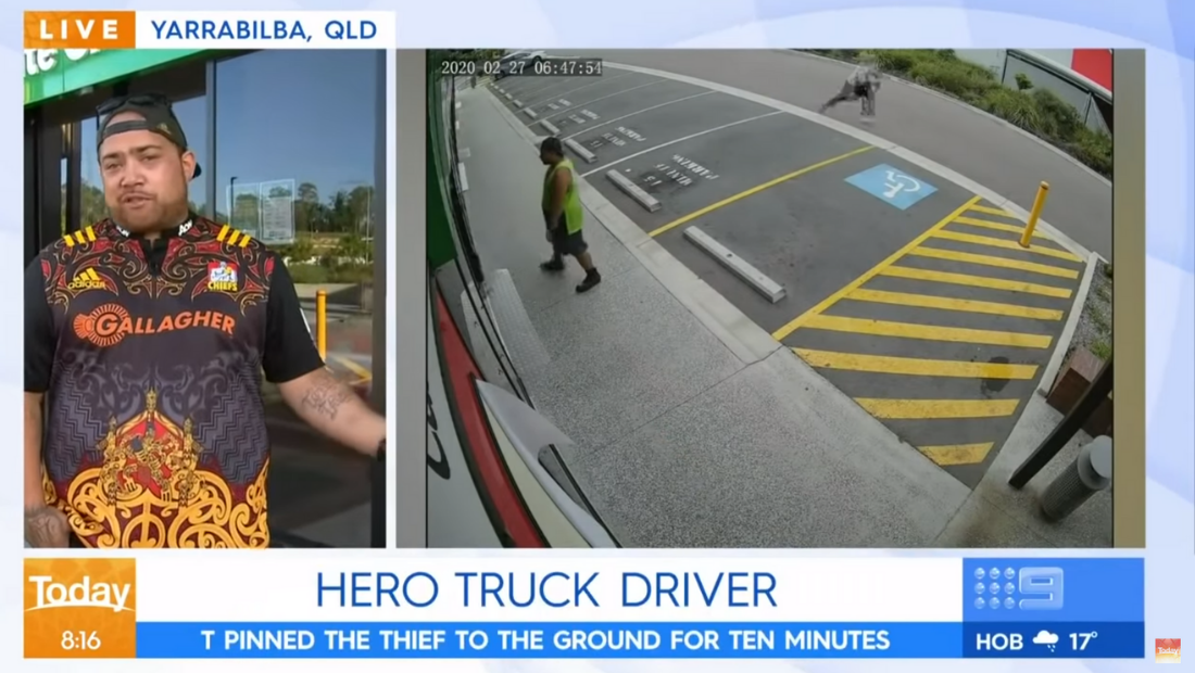 T was simply dropping off some magazines at his local Coles, when a lady in the medical center waved him down and told him a robbery was happening next door. T stood by the door and although the first robber got away, he pinned the second one down.