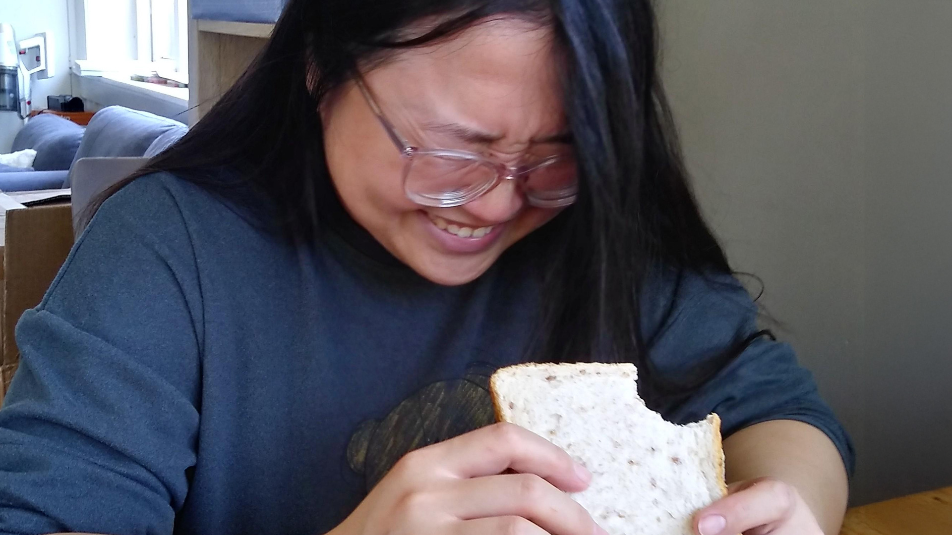 The pic of the moment shows his wife laughing, likely masking the shock of such a potent snack.