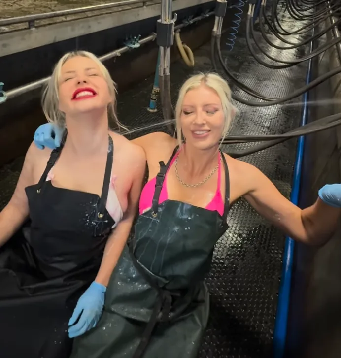 One of the clips shows the girls appearing to throw a bucket of milk on a water slide as the three slip down it, another shows a compilation of clips of the girls pouring more milk on themselves via a gumboot and straight from an udder.