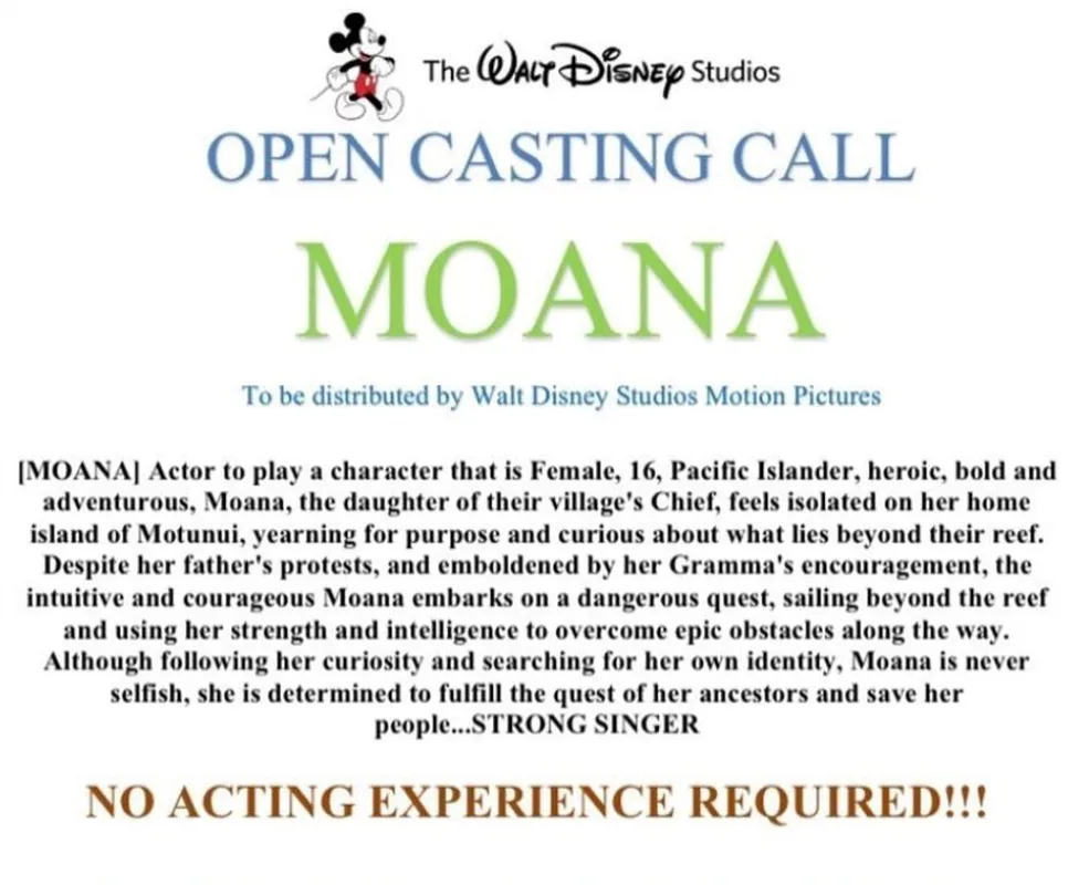 If you or someone you know is looking to audition, Disney has said to send your name, a recent photo, and your location to moana.casting@disneympp.com.