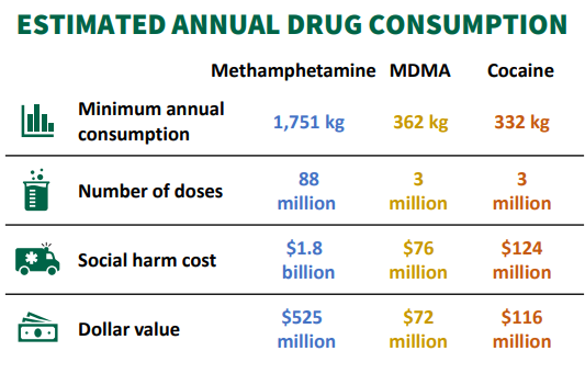 MDMA use has remained relatively steady, with around 362kg consumed in 2025, and an estimated weekly social harm cost of $1.4 million and $76 million a year.