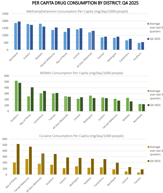 Around the country, cocaine use was highest in the Bay of Plenty, meth saw highest usage in Northland, and MDMA use peaked in the Southern district.