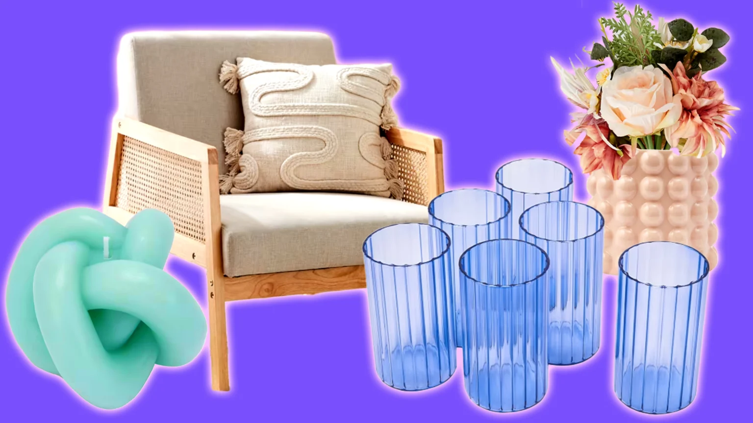 The new range includes colourful glassware, sculpted candles as well as boucle and rattan furniture.