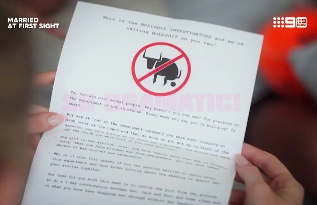 The full letter that MAFS AU's 'bullsh** investigators' Timothy Smith and Lucinda Light sent to Jack Dunkley and Tori Adams has been revealed.