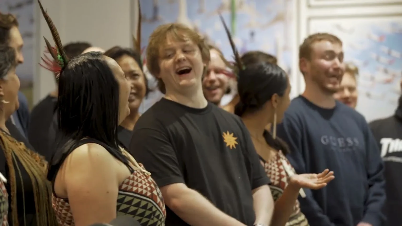 Hatea Kapa Haka welcomed the singer with a performance of 'Someone You Loved' in Te Reo, which, when he took a second to notice, happily pointed out to his crew that he knew it was his song.