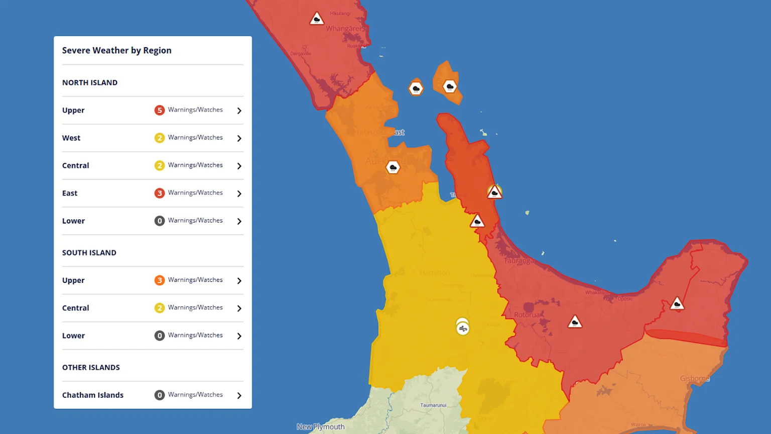 Red alerts for heavy rain are currently in place for Northland, the Coromandel, Bay of Plenty (including Rotorua), and Gisborne north of Tolaga Bay.