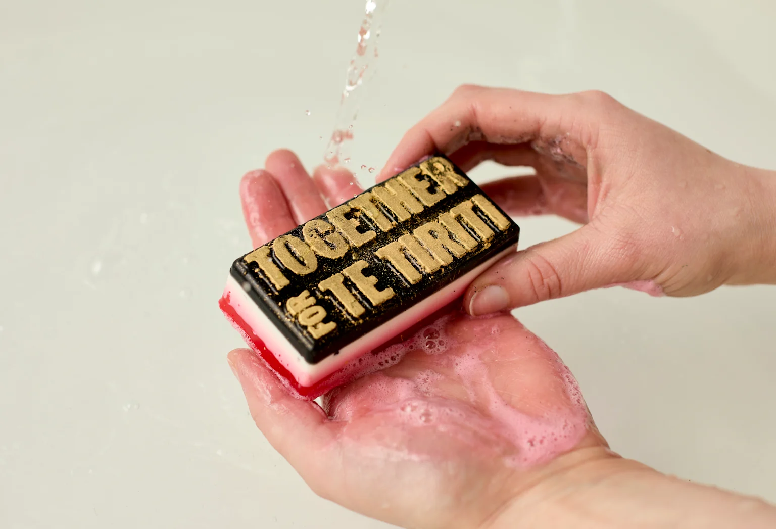 The Te Tiriti soap is black, white, and red - the colours of the Tino Rangatiratanga flag with the logo designed by Extended Whānau graphic design studio.