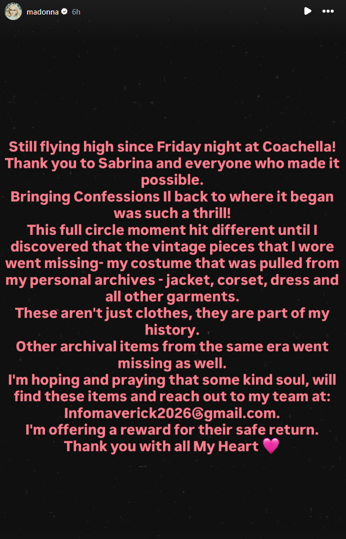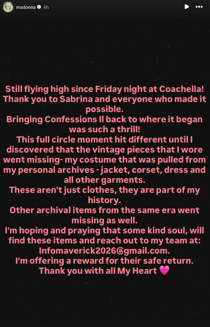 Madonna has revealed the vintage costume she wore at Coachella has gone missing and has offered a reward for its return.