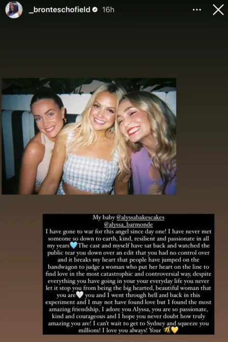 Bronte Schofield also hit out at fans' "tearing down" Alyssa after the show had ended.