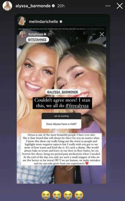 "Let's get this movement going because you guys are giving her such a horrible time and I promise you if you were there and doing the show with Alyssa, she would absolutely be one of your best friends," Melinda said of the way fans have treated the MAFS bride.