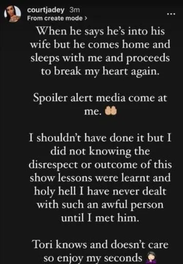 "When he says he's into his wife but he comes home and sleeps with me and proceeds to break my heart again," Courtney wrote. "I shouldn't have done it but I did not know the disrespect or outcome of this show.