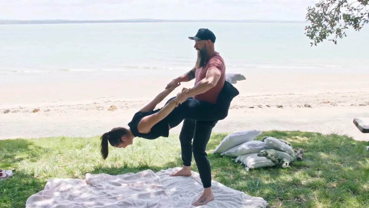 Steph and Mike bonded over a yoga challenge where the bride literally had to superman style hang off Kara's hubby with her legs fully wrapped around his waist.