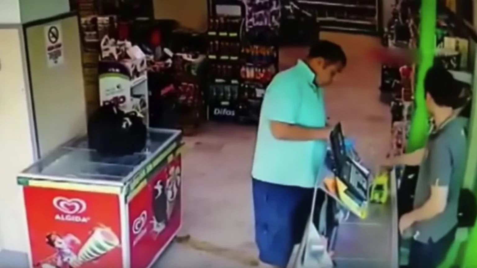 The footage was captured on CCTV in the north-western Turskish province of Sakarya, and shows the man try to act as though nothing has happened when trying to buy some items.