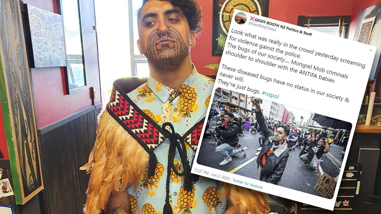 Alongside the photo of Kanuta, Booth, who says he is from the Waitaki District, ranted: "Look what was really in the crowd yesterday screaming for violence against the police. The bugs of our society... Mongrel Mob criminals shoulder to shoulder with the ANTIFA babies. These diseased bugs have no status in our society and never will. They're just bugs."