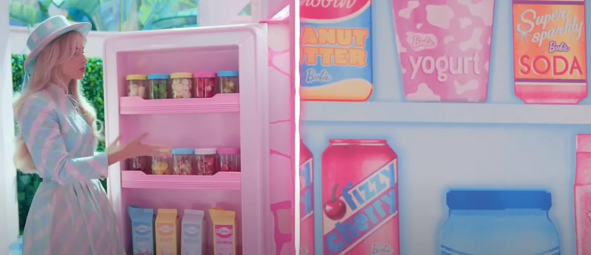 It was a very strategic design that came into play during the making of this film. Margot shared the magic with us while showing off her Barbie fridge full of a mixture of things that are physical and things that are 2D decals.