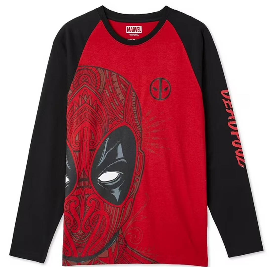 The long-sleeve tee, sold and shipped by Walmart Canada, features a large image of the popular masked character Deadpool. Within the mask, intricate details - including many resembling Māori tā moko - can be seen on the character's chin and forehead.