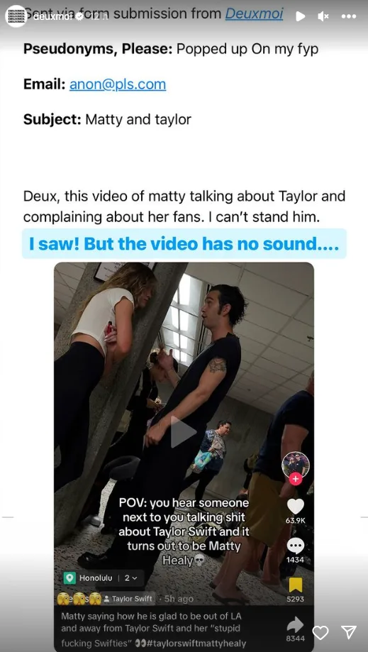 Instagram's resident gossip guru, DeuxMoi - who's basically the modern-day irl equivalent of 'Gossip Girl' - has spilled the tea with a TikTok clip allegedly showing Matty talking smack on the fandom.