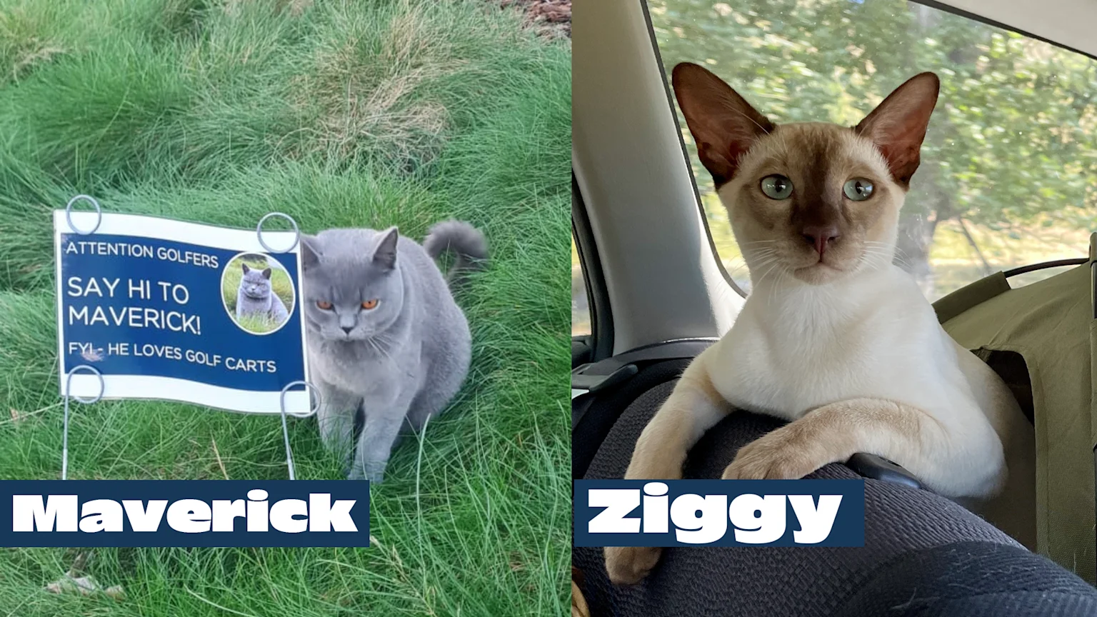 Maverick: "Maverick, an 8kg British Shorthair, is a fearless rule-breaker and local legend. He’s known for sneaking into homes, riding golf carts at Gulf Harbour, and demanding breakfast at 4:30 AM sharp. Despite being on a vet-ordered diet, he still charms neighbours into sneaky treats".
