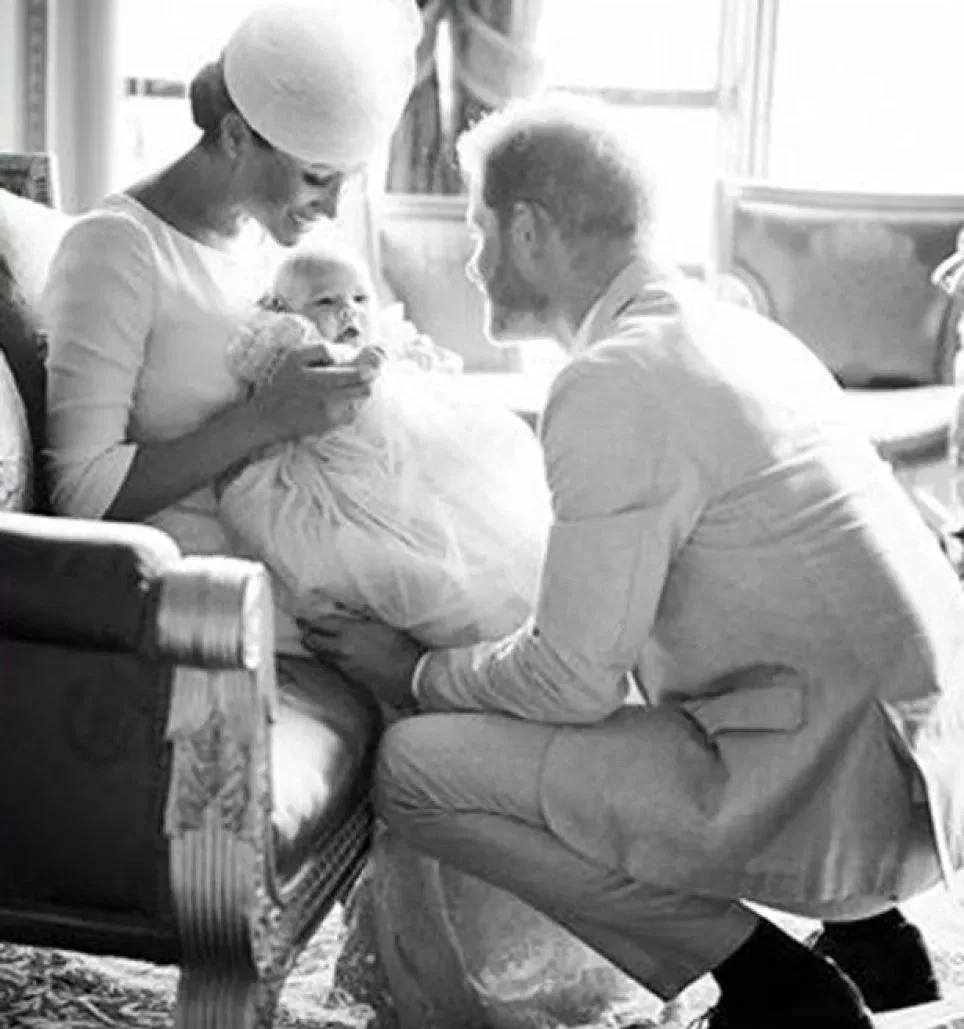The black and white photo of Archie Mountbatten-Windsor, taken by photographer Chris Allerton, has not been previously seen. It shows him wearing his christening gown as he is held by Meghan, while Harry looks up lovingly at both of them.