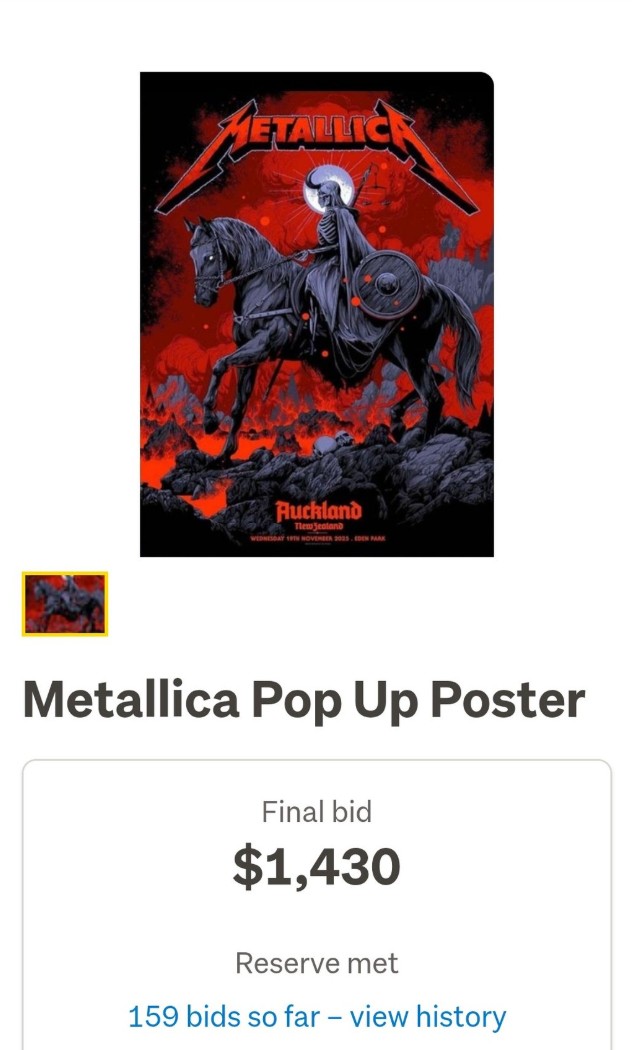 Following Metallica’s Eden Park show, Kiwis are trying to get their hands on the band's official Auckland posters, with one even selling on Trade Me for over a grand. Holy hecka.