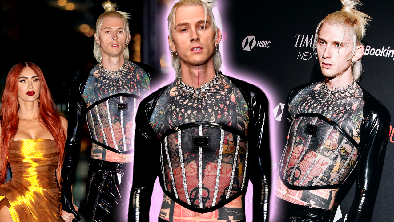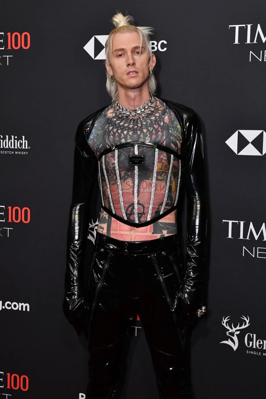 Joined by fiancée Megan Fox at the 2022 Time100 Next Gala, MGK turned heads in a sheer, bedazzled corset and latex shrug with matching gloves and low-rise pants.