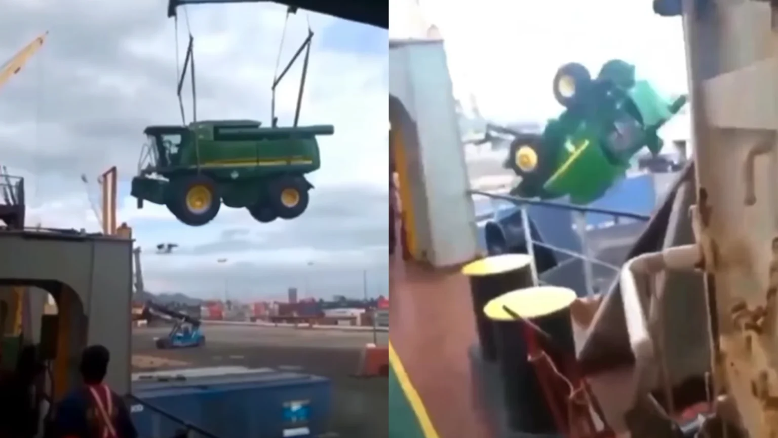 Instagram account @agri_fails posted a video (which they credited to @compoargentinoficial) that shows what looks like a container ship attempting to unload a John Deere combine harvester onto its dock.
