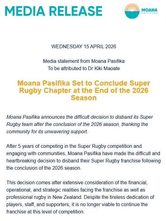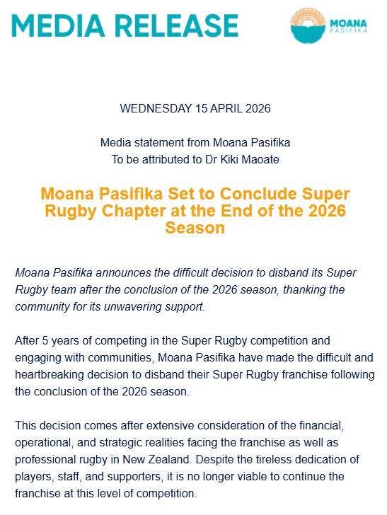 In a statement, Moana Pasifika says the decision comes after extensive consideration of the financial, operational, and strategic realities of the franchise, adding it is no longer viable to continue the franchise at this level of competition.