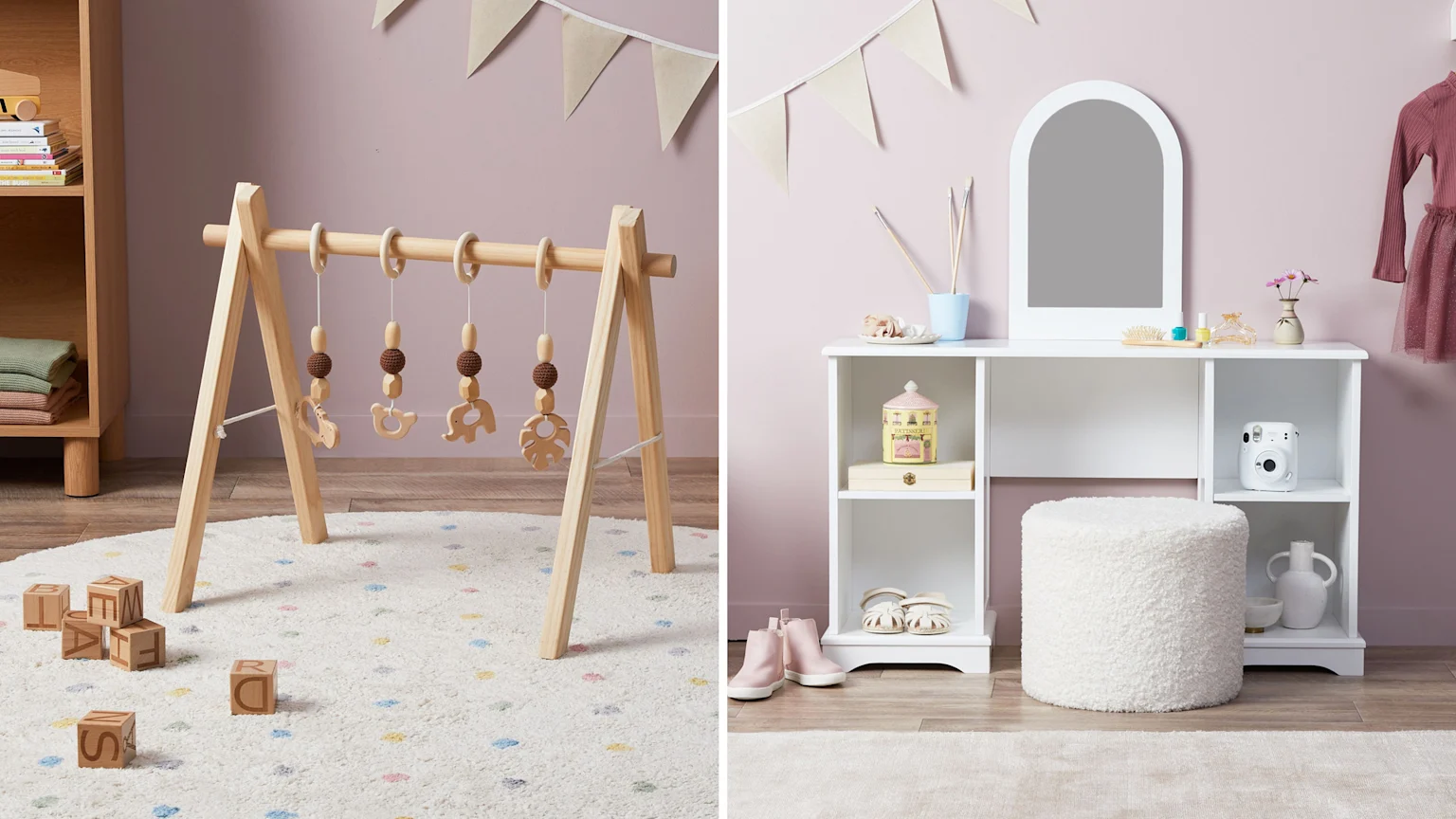 With the Wooden Baby Play Gym for sensory stimulation, the Play Vanity and Kids Hampton Kitchen, and the Theo Rotating Book Shelf, hours of fun are bound to be had.