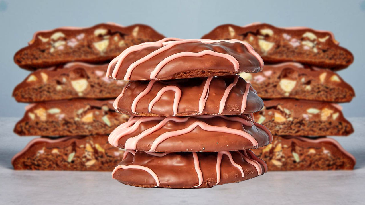 "Try our brand new Giant-Sized Moustache versions of the OG Candy Squiggle - Moustache cookie base, crunchy candy filling & a milk chocolate coating with the iconic pink squiggles on top."