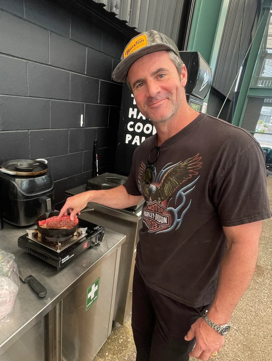That’s because Jay cooks steak, pork belly, sausages, and more on an outside camp cooker he’s brought in for the sole purpose of cooking delicious lunches.