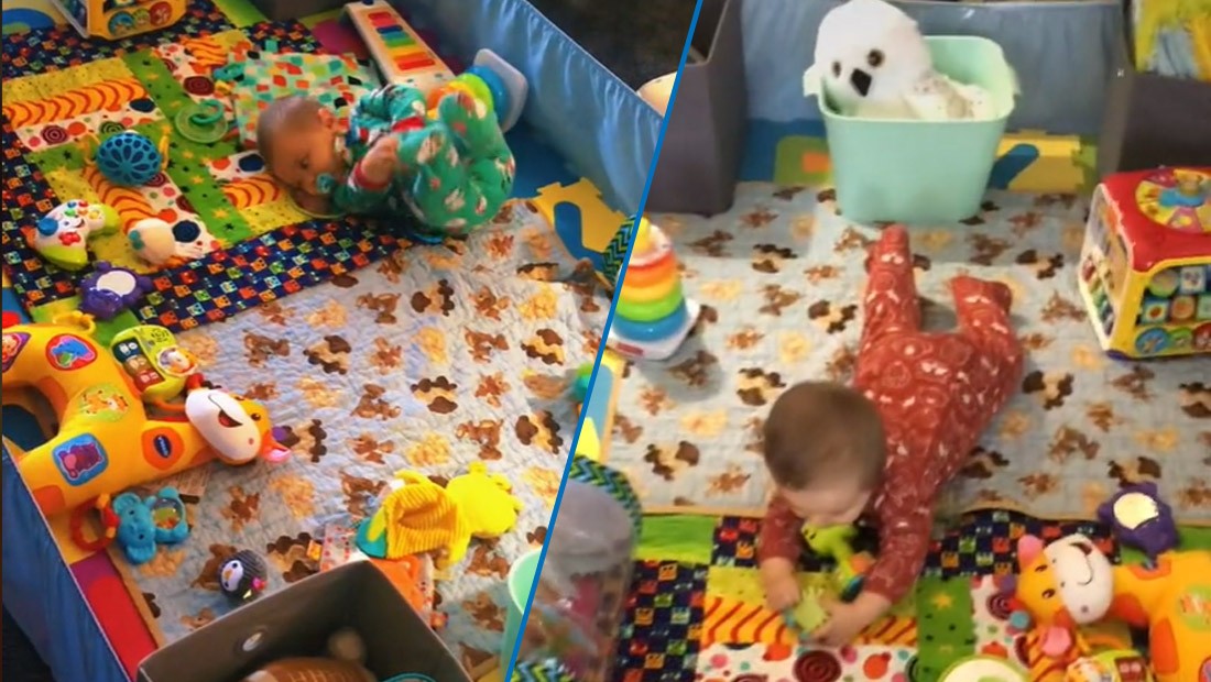 Using the fitted sheet as her base of her playpen, she uses four boxes of toys in each corner to keep the fitted sheet open, then lines the fitted sheet with playmats.