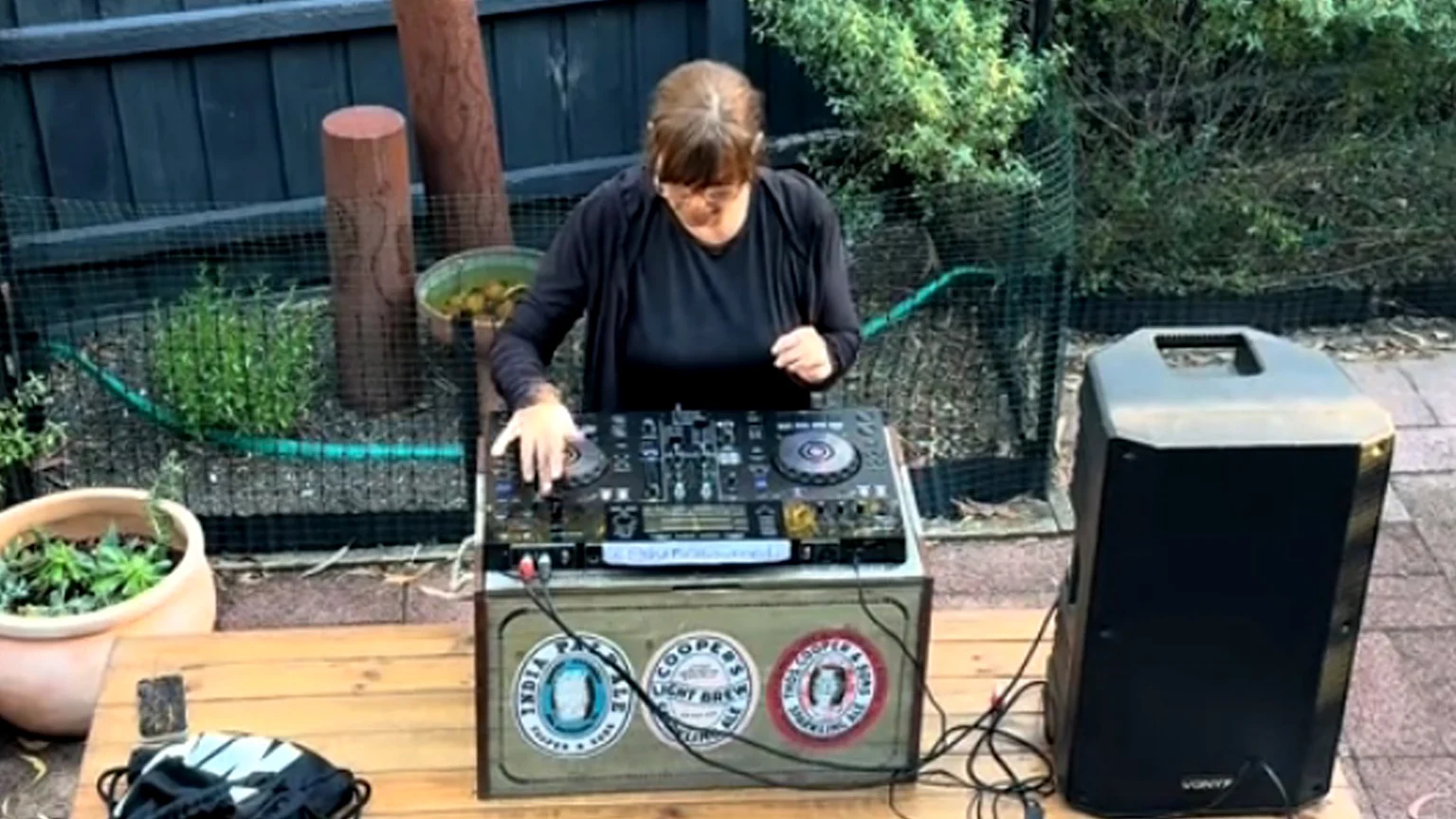 In the clip, mum’s locked in on the decks, mixing up a bit of Creeds ‘Push Up’.