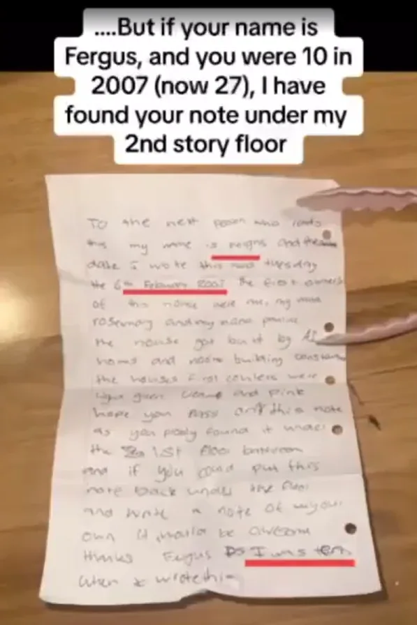 "If you could put this note back under the floor and write a note of your own, it would be awesome. Thanks, Fergus. PS I was ten when I wrote this," the note finished.