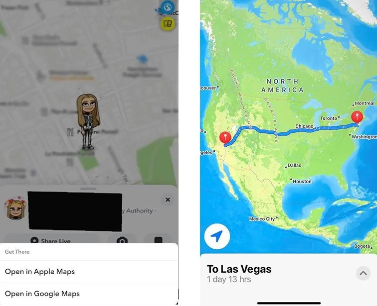 All someone has to do is tap on your Bitmoji in the maps screen, then a prompt comes up with a car, or pedestrian option with the time it would take to reach your destination.